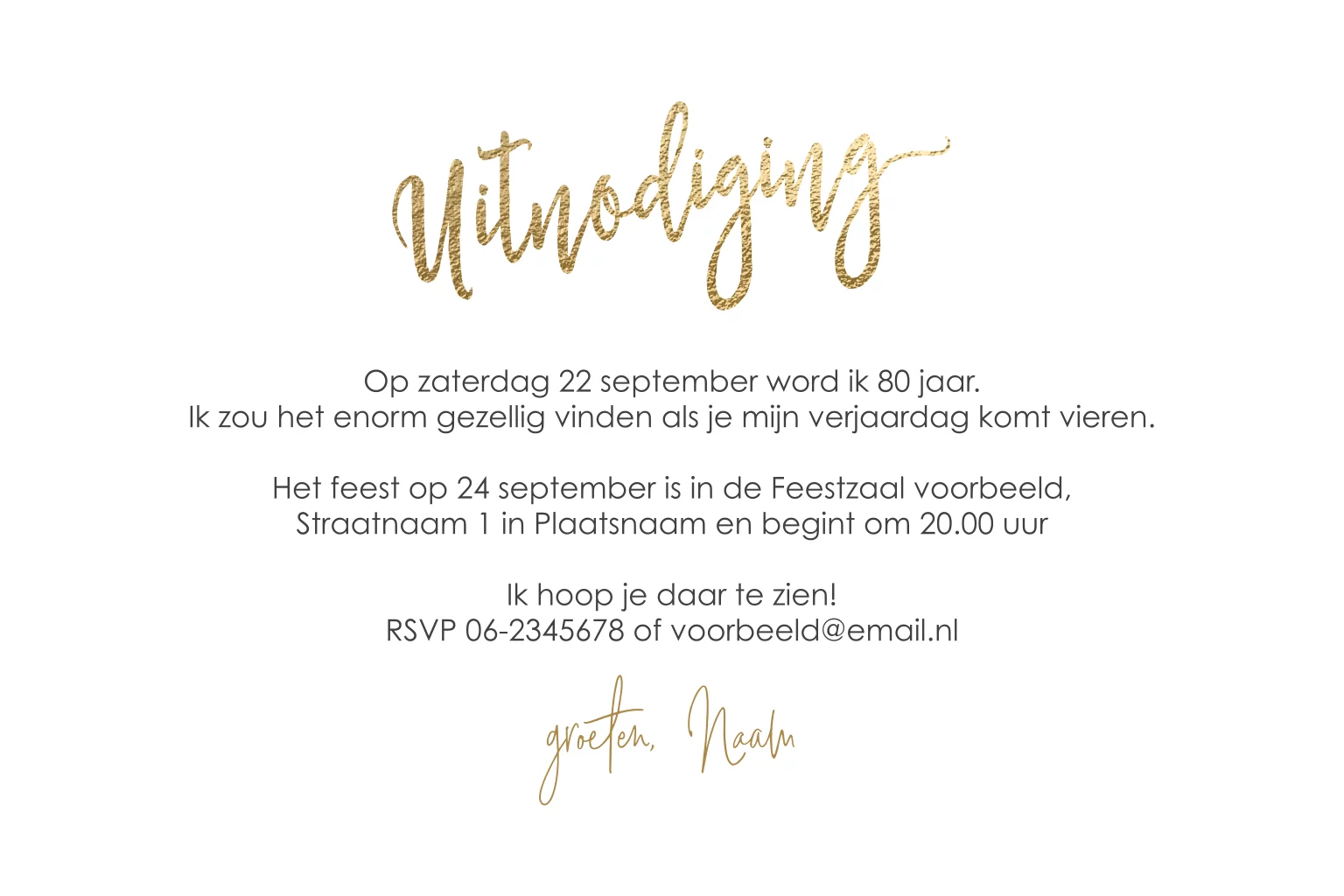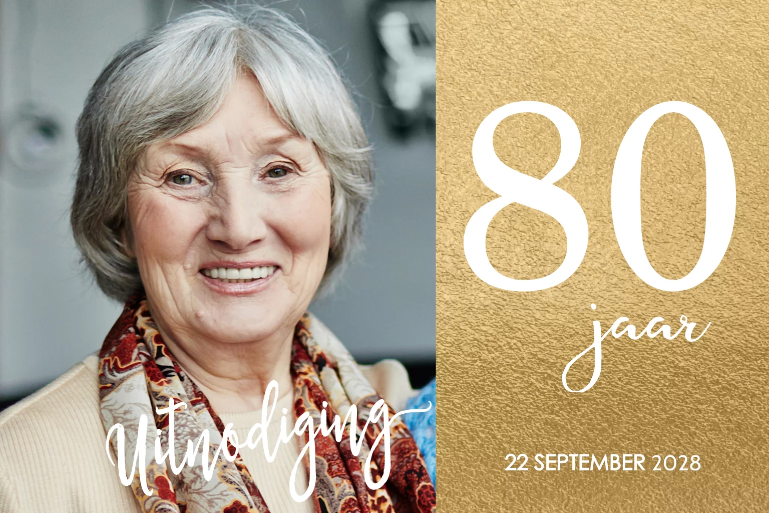 Maak zelf deze uitnodiging met eigen foto en goud effect ondergrond. Daarop in een sierlijk wit lettertype staat 80 jaar. Het jaartal is aan te passen.