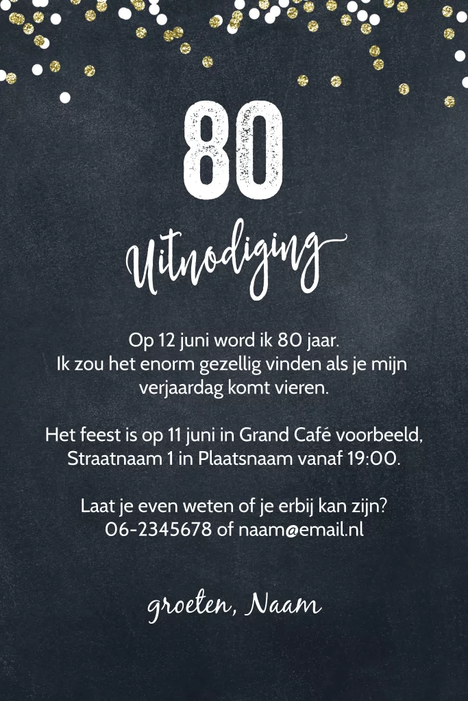 Zet een leuke eigen foto op de voorkant van de uitnodiging. Rondom staat feestelijke goud met witte confetti stippen en in witte typografie "uitnodiging 80". In de binnenzijde kun je een originele uitnodigingstekst schrijven. Alles op deze uitnodigingskaart is gemakkelijk aan de passen.