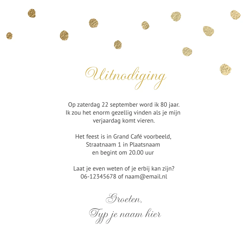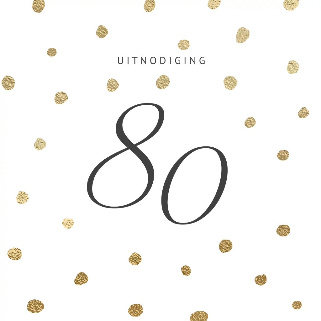De feestelijke gouden confetti stippen en stijlvolle donkere typografie op de witte achtergrond geven deze uitnodigingskaart een mooie en luxe uitstraling. Maak deze luxe uitnodiging voor een 80ste verjaardag of pas de leeftijd aan naar ieder gewenst getal.