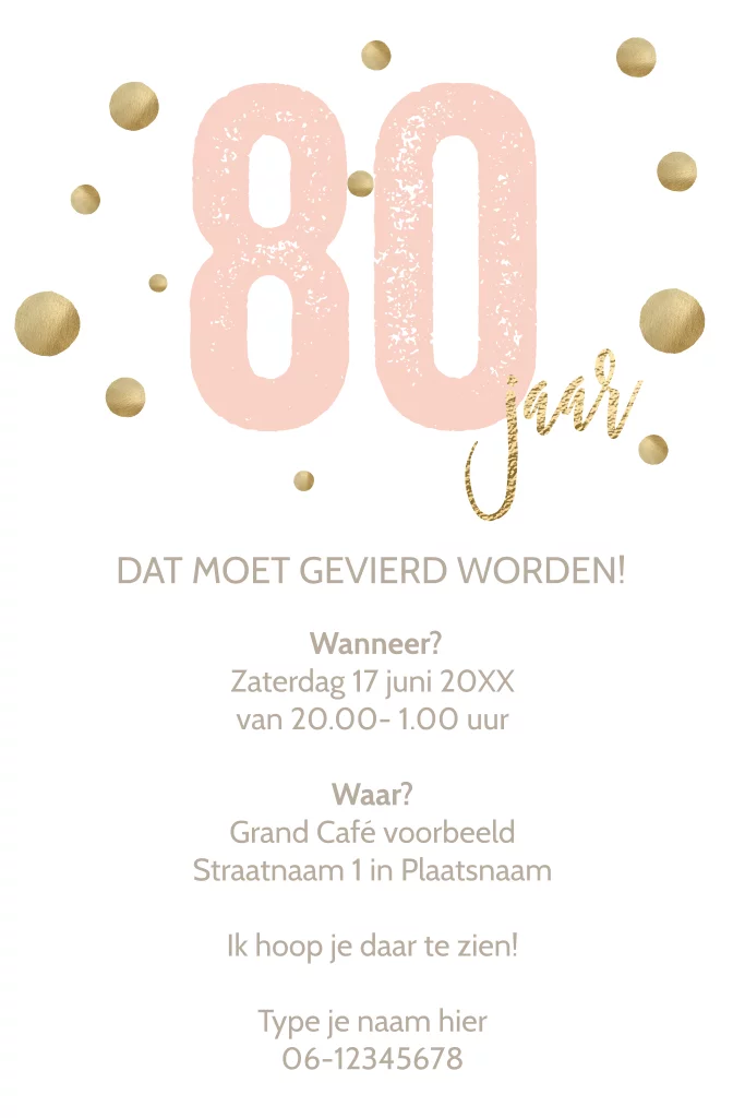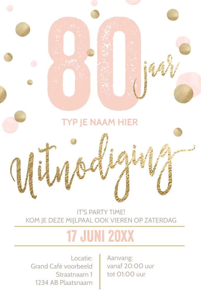 Luxe verjaardag uitnodigingen voor 80 jaar die je gemakkelijk kan aanpassen met onze kaarten editor. Met mooie gouden en roze letter typografie op een witte achtergrond.
