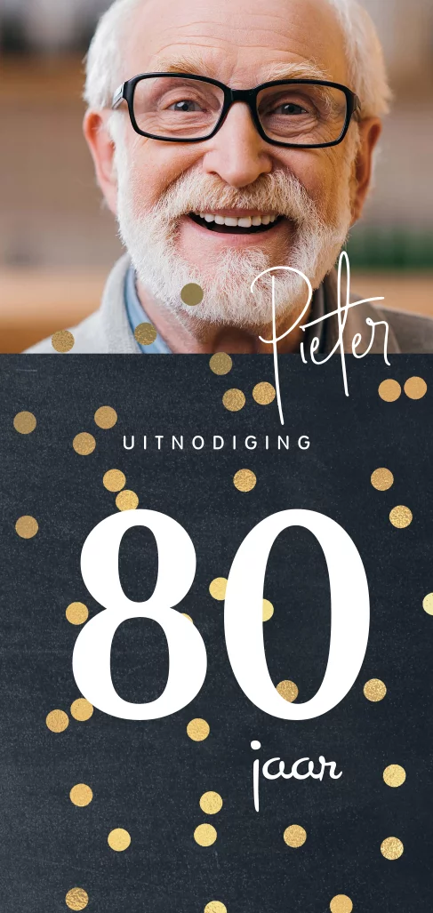 Met een leuke eigen foto maak je de uitnodiging helemaal af. Feestelijke 80 jaar verjaardagsuitnodiging met eigen foto van Luckz.