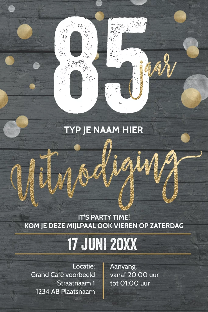 Het getal 85 jaar is aanpasbaar naar iedere leeftijd. Alles op deze uitnodigingen kun je zelf eenvoudig personaliseren en bestellen bij Luckz