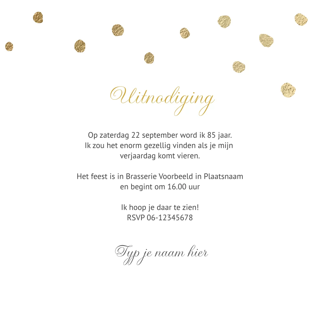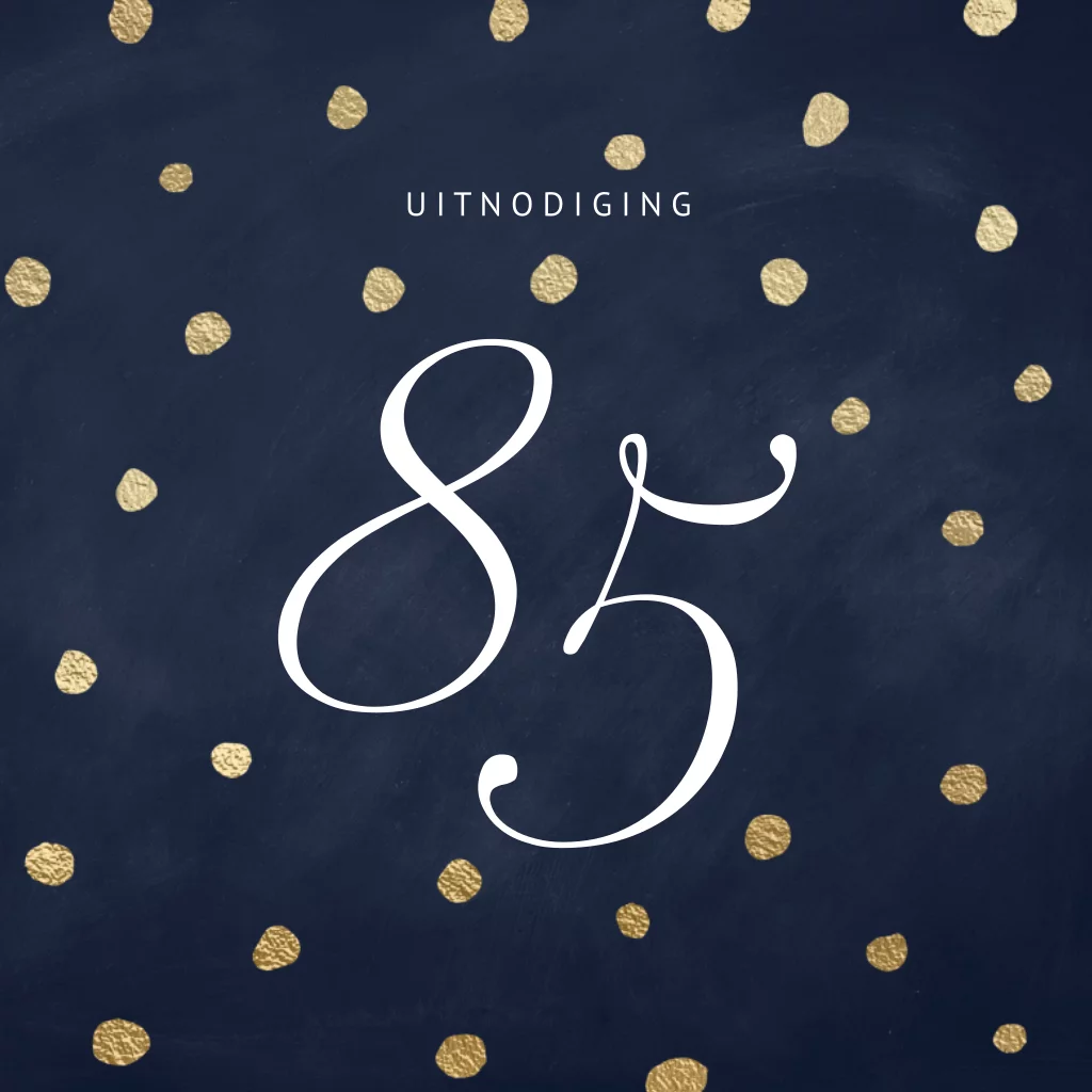 Een chique uitziende uitnodiging voor een vijfentachtigste verjaardag met stijlvolle gouden stippen op een donker blauwe achtergrond en groot de leeftijd 85 jaar (aanpasbaar) in witte typografie op de voorkant. In de binnenkant komen de gouden stippen terug en kun je alle uitnodiging informatie schrijven.
