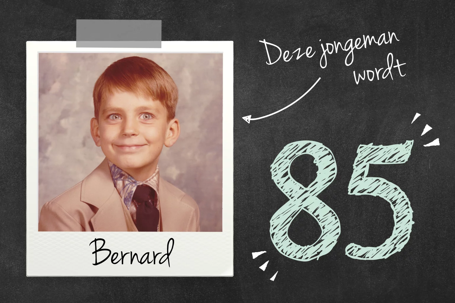 Zet je eigen foto van vroeger op de voorkant van de uitnodiging, erg leuk voor de ontvangers om te zien hoe je er vroeger uitzag. Deze uitnodigingen voor je verjaardag van vijfentachtig jaar zijn eenvoudig zelf te personaliseren en te bestellen bij Luckz.