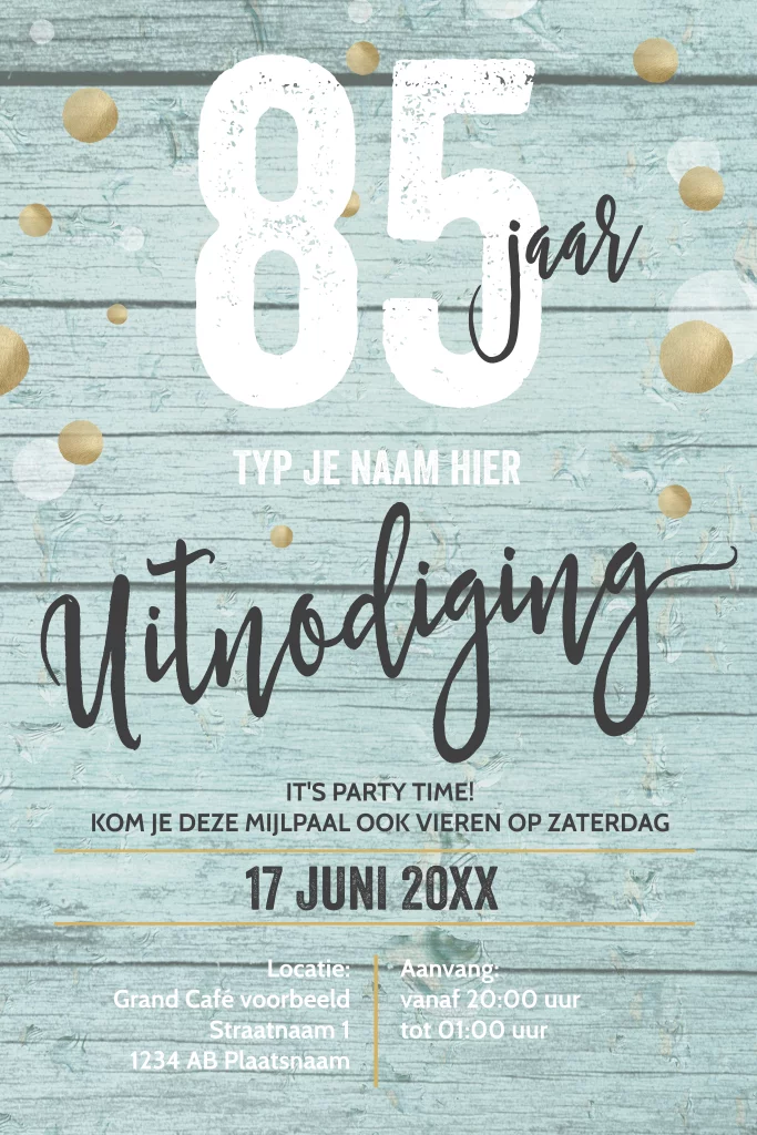 Mooie uitnodiging voor een gezellige verjaardag voor 85 jaar. Met een mint groene houten achtergrond en leuke typografie. Je kan zelf deze uitnodigingen eenvoudig personaliseren en ontwerpen, pas de leeftijd, namen, kleuren en teksten aan.