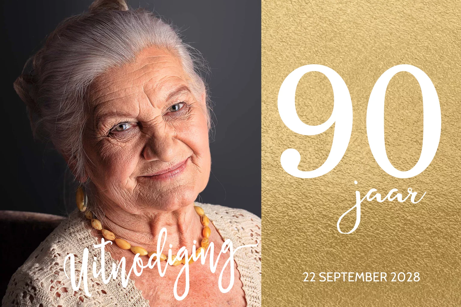 Chique 90 jaar uitnodiging met eigen foto. Met goud effect kleuren en mooie stijlvolle typografie van Luckz.
