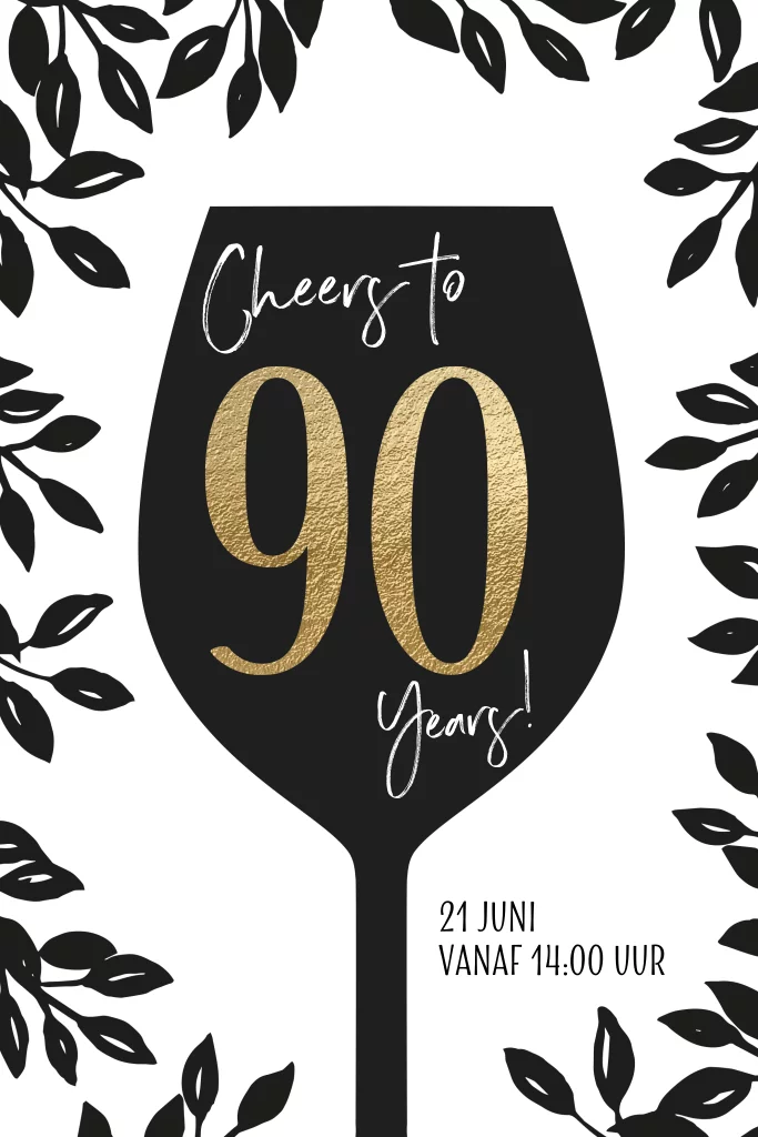 Chique verjaardag uitnodiging voor 90 jaar met mooie illustraties, kleuren zwart, wit, goud en typografische teksten "Cheers to 90 years!".