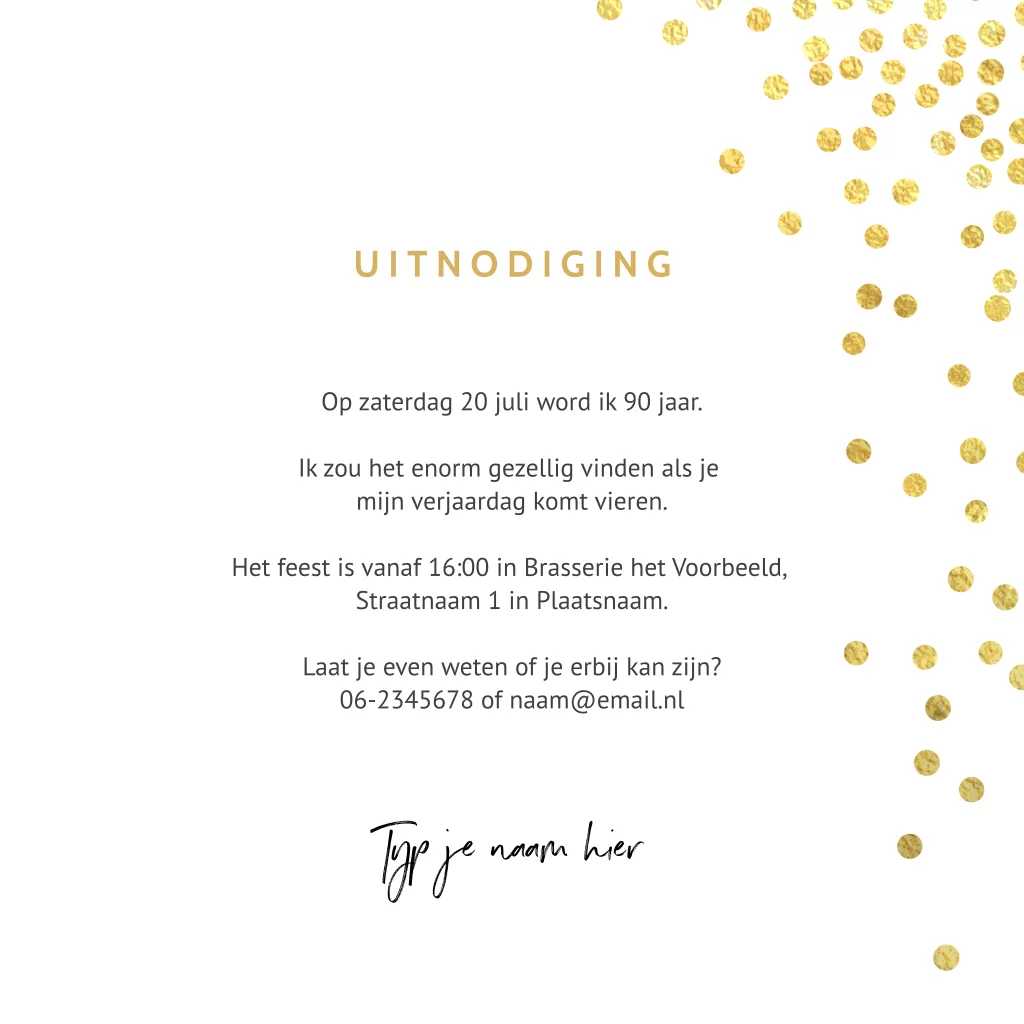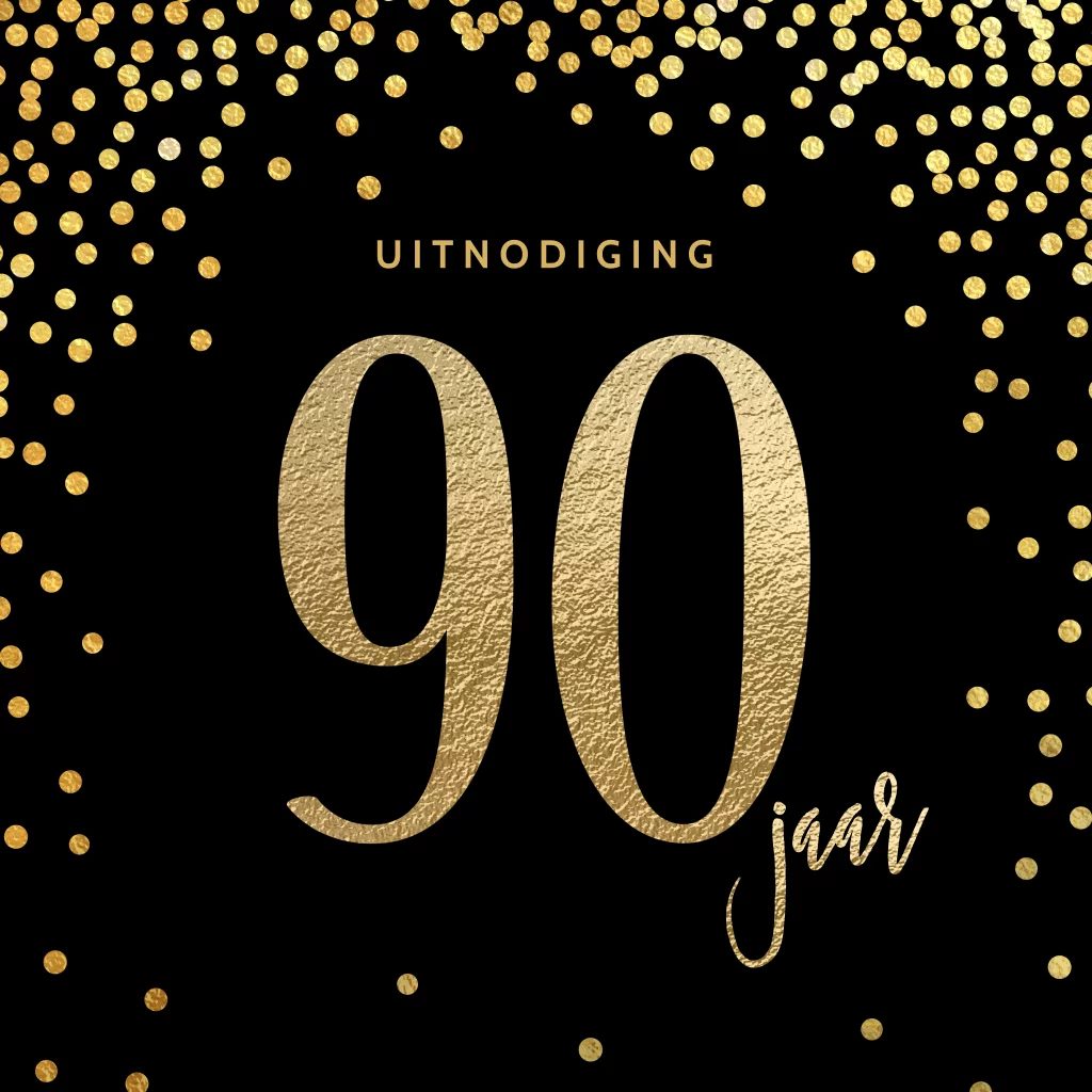 Elegant design verjaardag uitnodiging voor 90 jaar met feestelijke gouden confetti en groot het getal 90 op een zwarte achtergrond.
