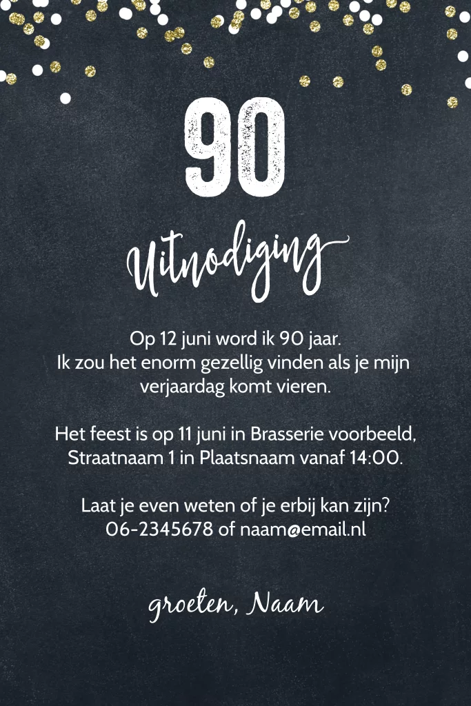 Zet een leuke eigen foto op de voorkant van de uitnodiging. Daarop staat in witte typografie "uitnodiging 90" met rondom feestelijke goud met witte confetti stippen. In de binnenzijde kun je een originele uitnodigingstekst schrijven. Alles op deze uitnodiging is gemakkelijk aan de passen.