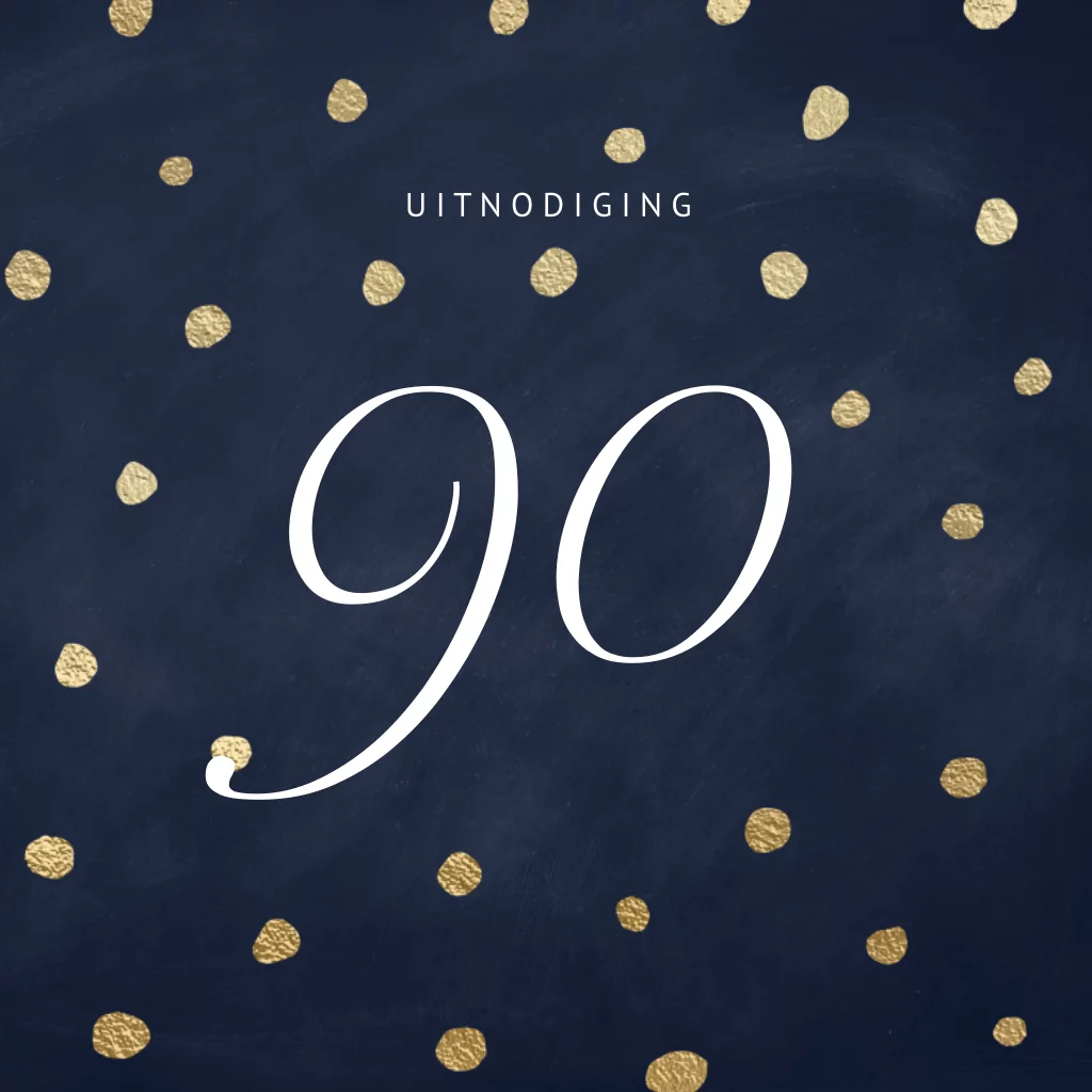 Een chique uitziende uitnodiging voor een negentigste verjaardag voor een man of vrouw. Met een donker blauwe achtergrond met gouden confetti stippen en in stijlvolle witte typografie de leeftijd 90 jaar. De gouden stippen komen in de binnenkant van de uitnodigingskaart weer terug.