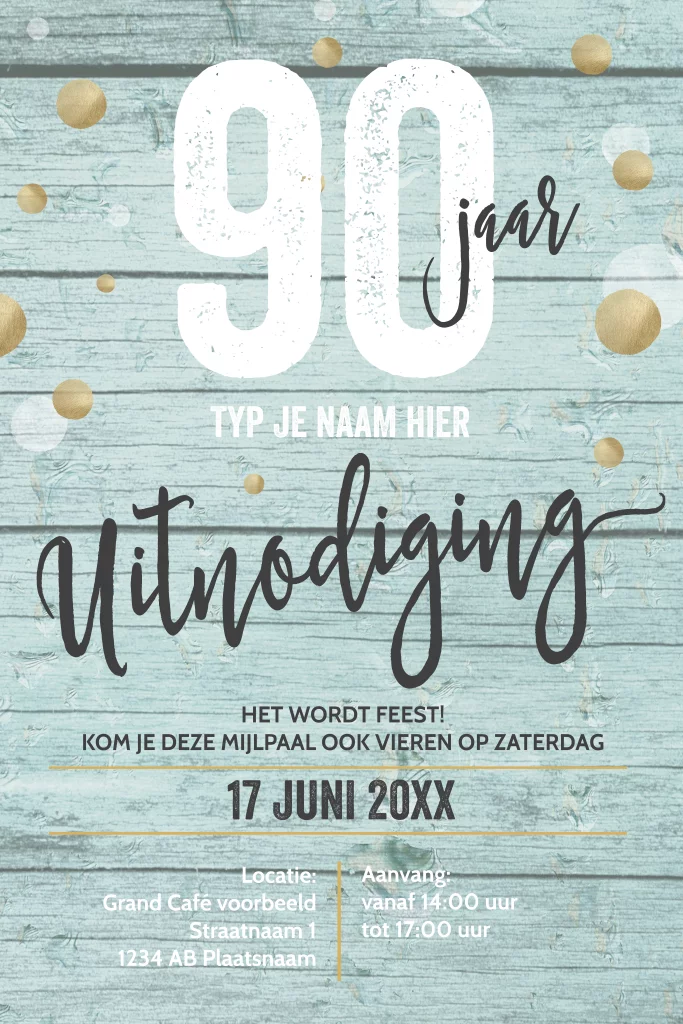 Feestelijke en stijlvolle uitnodiging voor een verjaardag van 90 jaar. Stijlvolle typografische teksten op een mint hout look achtergrond.