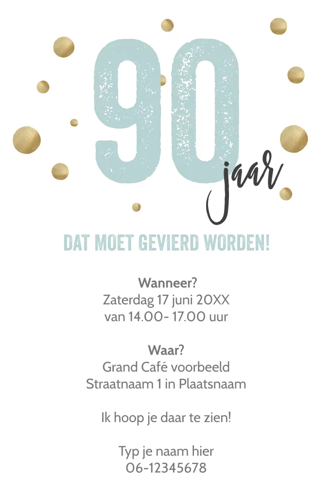 Pas de teksten, leeftijd, naam en kleuren aan met de editor. Zo ontwerp je een bijzondere uitnodiging voor een 90ste verjaardag.