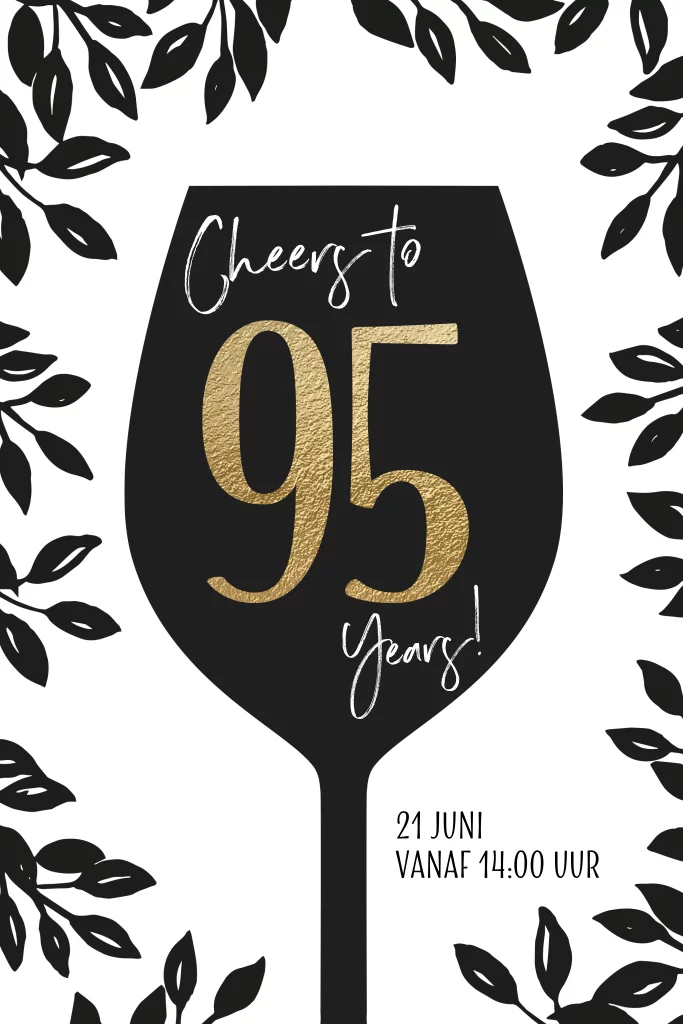 Chique verjaardag uitnodiging 95 jaar met stijlvolle zwart, wit, gouden kleuren, een glas in slhout en mooie typografische teksten "Cheers to 95 years!".