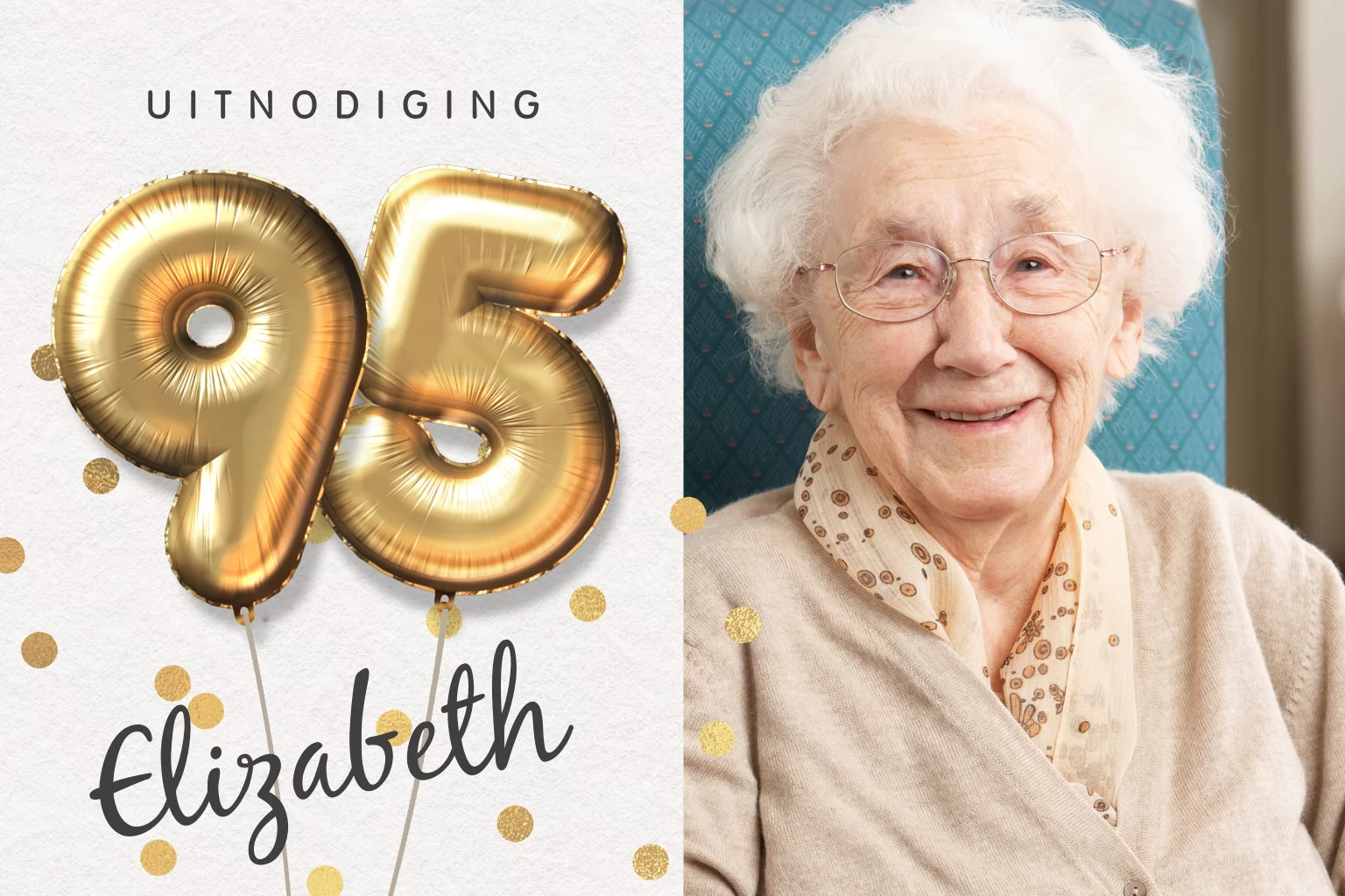 Alle gouden ballon jaartallen zijn mogelijk. Neem gerust contact met ons op en wij helpen graag met het ontwerpen van een eigen originele verjaardag 95 jaar uitnodigingen.