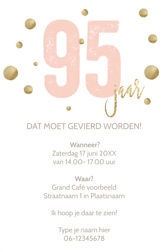 Luxe verjaardag uitnodigingen voor 95 jaar. Zo'n prachtige mijlpaal vraagt om een originele uitnodiging. Met mooie gouden en zalm roze typografie op een witte achtergrond.