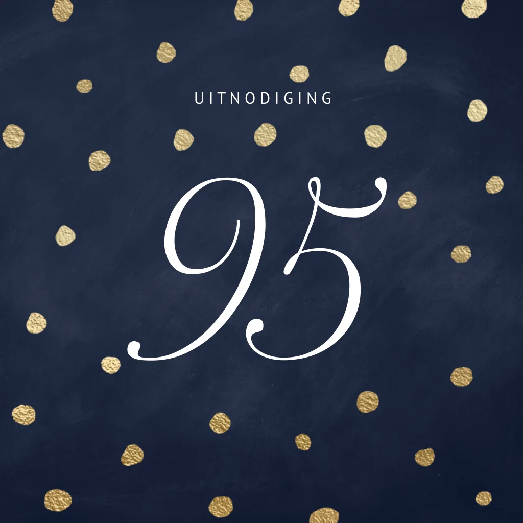Een chique uitziende uitnodiging voor een vijfennegentigste verjaardag met mooie gouden stippen op een donker blauwe achtergrond. Voorop de uitnodiging staat groots de leeftijd 95 jaar (aanpasbaar) in witte typografie op de voorkant. In de binnenkant komen de gouden stippen terug en kun je alle uitnodigingsinformatie schrijven.