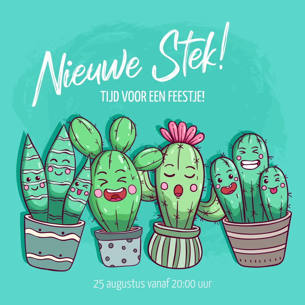 Grappige housewarming uitnodiging om mensen uit te nodigen om je nieuwe woning te bekijken nadat je bent verhuisd en het te vieren. Met een grappige illustratie van vrolijke cactussen. Pas zelf gemakkelijk alle teksten aan.