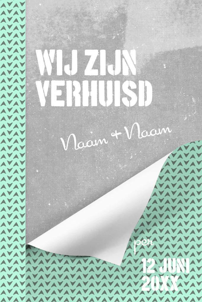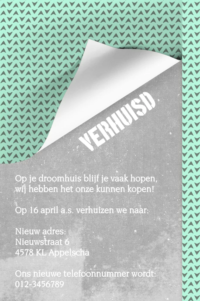 Verhuiskaart met groen behang met mooie patronen en een stoere beton look. Trendy kaart van Luckz.