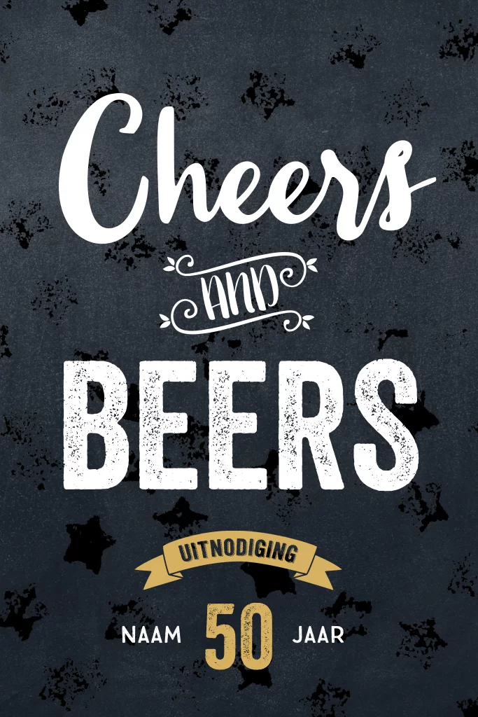 Hippe uitnodiging met typografische teksten Cheers and Beers op een krijtbord achtergrond. Nodig je vrienden en familie uit voor een biertje op je verjaardagfeest! De alles op deze leuke uitnodigingen zoals leeftijd, teksten, kleuren zijn eenvoudig te personaliseren in de editor.