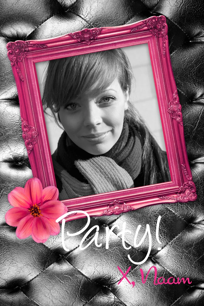 Maak deze stoere verjaardagsfeest uitnodigingskaart voor jouw verjaardag. Zwart leer rondom de kaart met een fotolijst en roze bloem.
