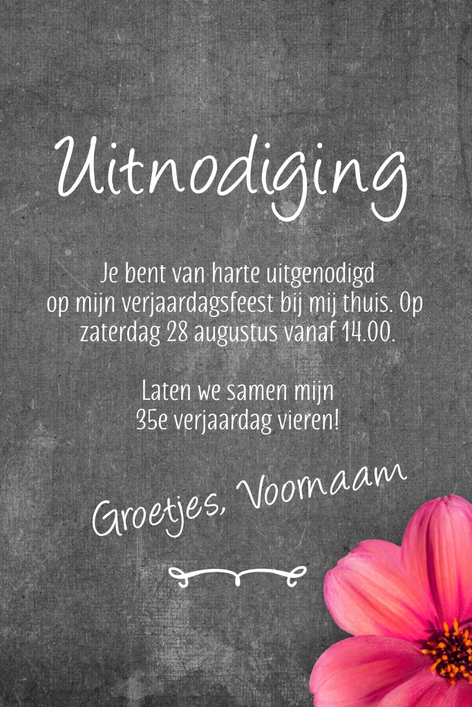Stuur al je vrienden deze mooie stoere uitnodigingen voor jouw verjaardagsfeest en laat het feest maar beginnen. Laat je zelf stralen op de voorkant van de kaart met de mooiste foto die je hebt. De bloem en de tekst FEESTJE! Maken de uitnodiging kaart helemaal compleet.