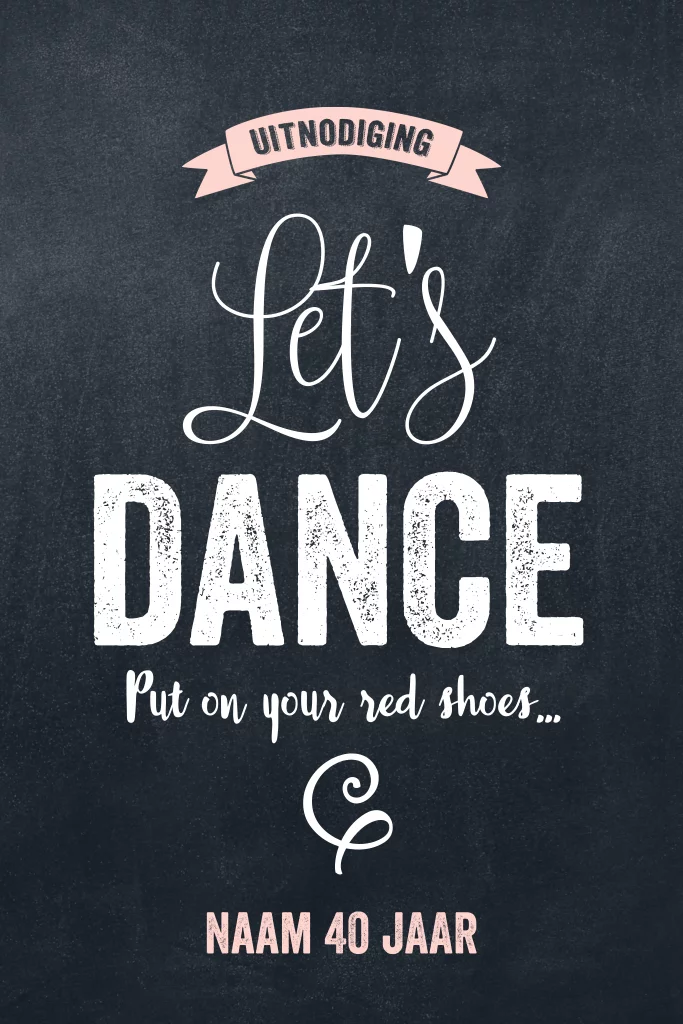 Let's Dance! Super unieke feest uitnodigingskaart met hippe typografie en krijtbord achtergrond met zwart roze tinten. Laat met deze unieke uitnodiging weten dat al je vrienden en vriendinnen welkom zijn op je verjaardagsfeest.