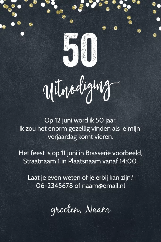 In de binnenkant van de uitnodiging staat een krijtbord effect achtergrond en de uitnodigingstekst. De leeftijd is aan te passen naar ieder gewenst getal. Maak zelf deze originele uitnodigingskaarten voor een man of een vrouw bij Luckz.