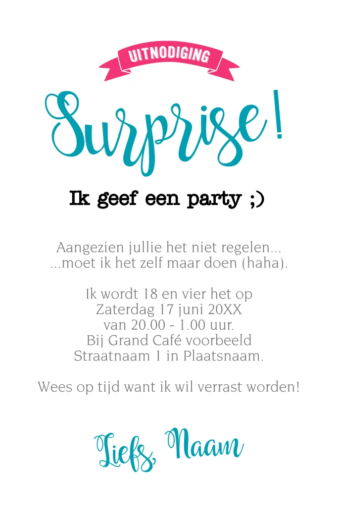 Geef je eigen surprise party voor 18 jaar met deze grappige originele uitnodiging. Je wordt 18 en dat moet natuurlijk gevierd worden met een groots feest! Het liefste wil je verrast worden, maar niemand die het regelt....