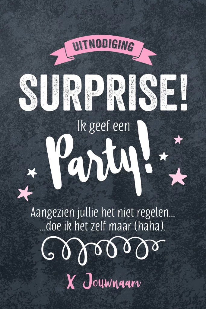 Laat jezelf verrassen en geef zelf je eigen surprise party! Met deze grappige uitnodigingen. Met een hippe krijtbord achtergrond en grappige typografische teksten.
