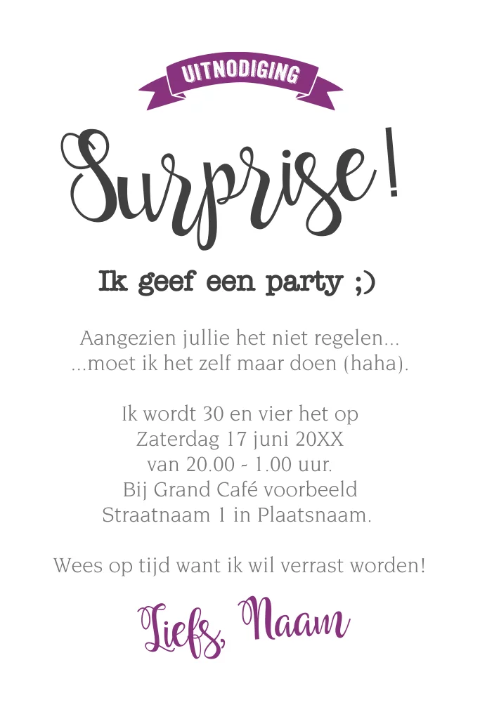 Grappige en originele uitnodigingskaart van Luckz, die je ook voor een échte surprise party kan personaliseren natuurlijk.