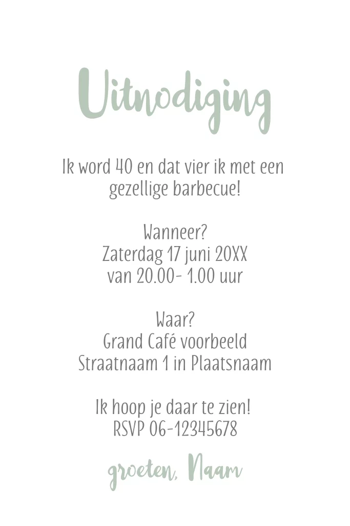 Leuke en grappige verjaardag uitnodiging met de tekst "Oh nee ik word 45 jaar, gelukkig is er BBQ". Alle kleuren, de leeftijd en teksten kun je aanpassen. Zo verander je het woord BBQ gemakkelijk in bier, feest, muziek of een ander woord dat goed bij je past. Alles op deze uitnodiging kun je eenvoudig personaliseren.