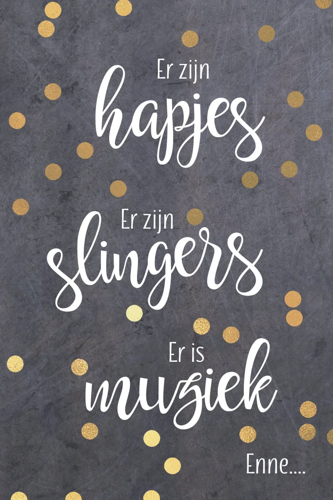 Op de hippe krijtbord achtergrond met confetti staat de volgende leuke tekst: