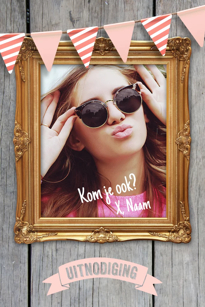 Er wordt er een jarig, en dat ben jij! Creëer je eigen verjaardag uitnodiging kaart voor al je dierbaren om je heen. Met een hippe steigerhouten achtergrond met daarop een cool fotolijstje waarin je jouw verjaardags foto in kan zetten. De slinger met vlaggetjes hangen speels over het lijstje heen. Nodig iedereen uit voor jouw verjaardagsfeestje met deze trendy kaart.