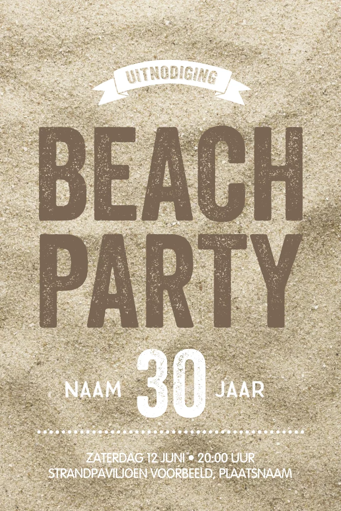 Maak deze hippe uitnodiging voor je strandfeest, met een mooie zand achtergrond en hippe typografie. Die je eenvoudig zelf kan personaliseren bij Luckz.