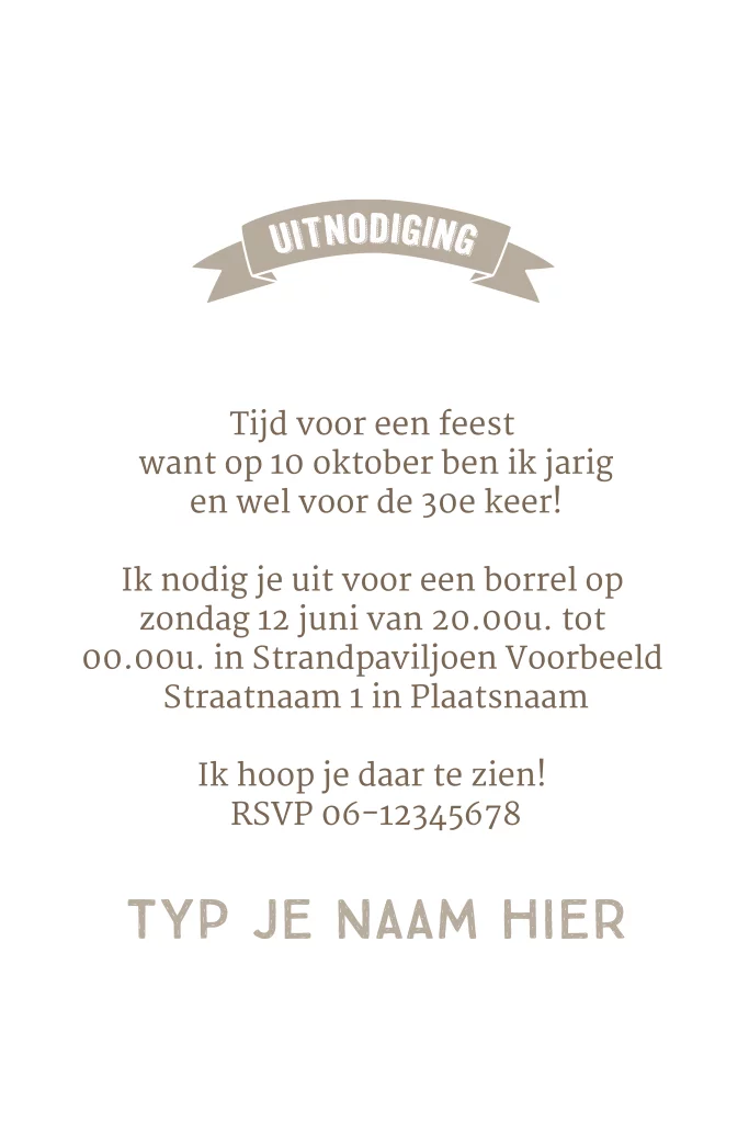 Deze uitnodiging kan volledig worden aangepast aan jouw wensen. Ga je een bedrijfsfeest geven op het strand? Ga je trouwen of geef je een verjaardagsfeest? PAs alle teksten, jaartallen aan, kies jouw favoriete kleuren en voeg persoonlijke teksten toe om de uitnodiging helemaal eigen te maken. Zo weet iedereen dat ze niet kunnen ontbreken op jouw strandfeest.