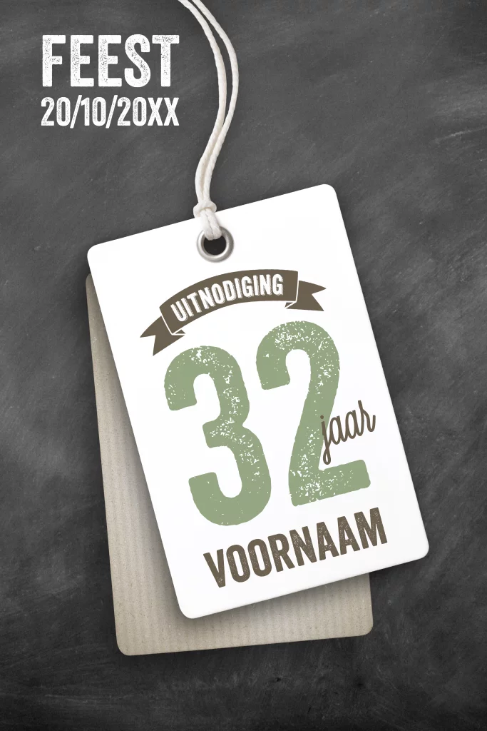 Hippe uitnodigingskaart voor een verjaardag. Met een groot wit label op een achtergrond van stoer krijtbord en aanpasbaar jaartal. Trendy verjaardagsuitnodiging van Luckz.
