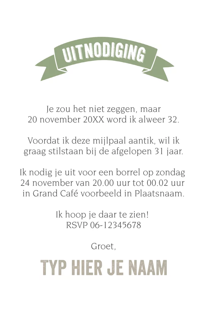 Het is bijna zover, jouw verjaardag komt er weer aan. Tijd om een originele uitnodiging te maken voor het verjaardagsfeest. Schrijf jouw jaartal en naam op de voorkant op het label. Pas de kleuren aan zoals jij wilt. Schrijf de uitnodigingstekst aan de binnenkant en het feest kan beginnen.