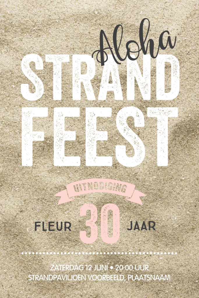 Ga jij op een unieke strand locatie een feestje geven? Maak gebruik van deze originele uitnodigingskaart voor jouw strandfeest. De voor en achterzijde zijn bedekt met zand. De binnenzijde zacht roze (kleuren zijn aanpasbaar) en ruimte voor een leuke uitnodigingstekst. Het jaartal is aanpasbaar met de editor.