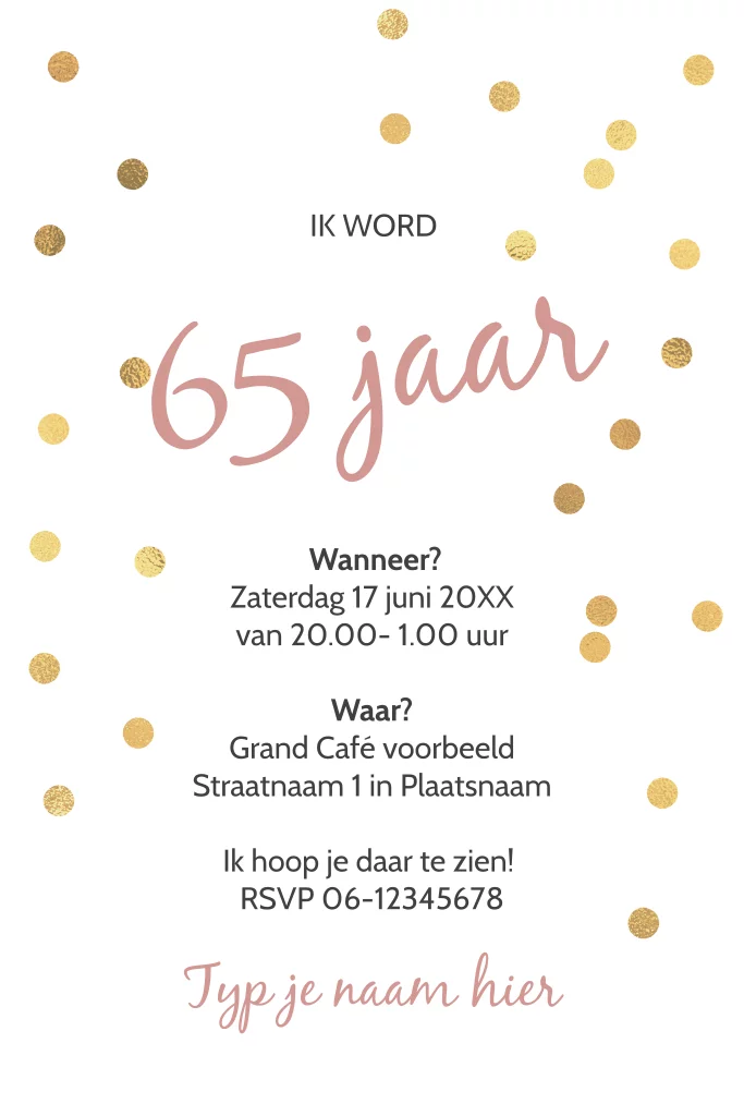 Vier jij binnenkort je 65ste verjaardag en wil je dit groots aanpakken? Dan is deze uitnodigingskaart perfect voor jou! Met onze handige editor kun je eenvoudig zelf deze persoonlijke uitnodiging ontwerpen voor een onvergetelijk feest. Ontwerp zelf deze mooie verjaardag uitnodiging voor 65 jaar, met gouden confetti en cijfer ballonnen op een lichte achtergrond.