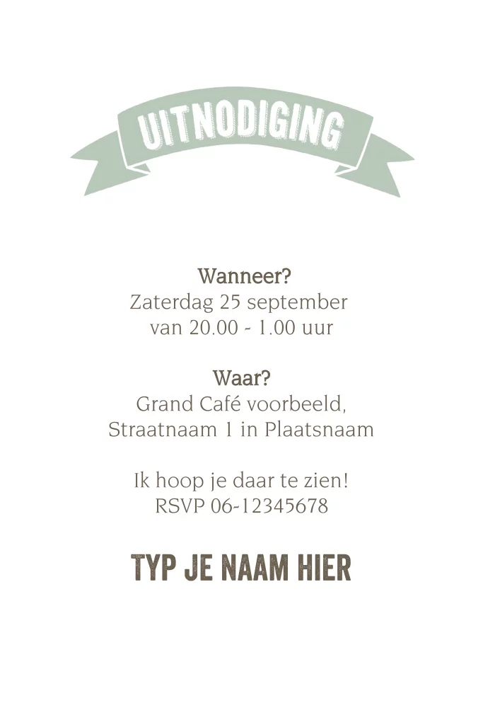 Tijd voor een groot feest! Laat met deze leuke uitnodigingskaart weten dat je een verjaardagsfeest geeft. Gebruik het label op de voorkant voor jouw jaartal en naam. Pas de binnenkant aan met een leuke verjaardag uitnodigingstekst. Ontwerp zelf de uitnodiging naar jouw eigen stijl en laat het feest maar losbarsten!