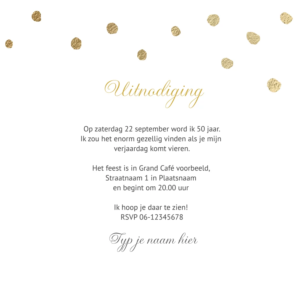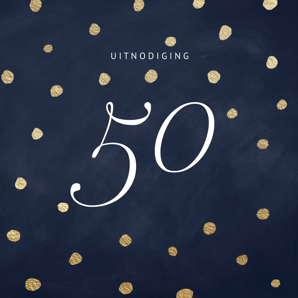 Een chique uitziende uitnodiging voor een verjaardag voor een man of vrouw met mooie gouden stippen op een donker blauwe achtergrond en groot de leeftijd 50 jaar (jaartal is aanpasbaar) in witte typografie op de voorkant. In de binnenkant van de uitnodigingskaart komen de gouden stippen terug en kun je alle uitnodigingsinformatie schrijven.