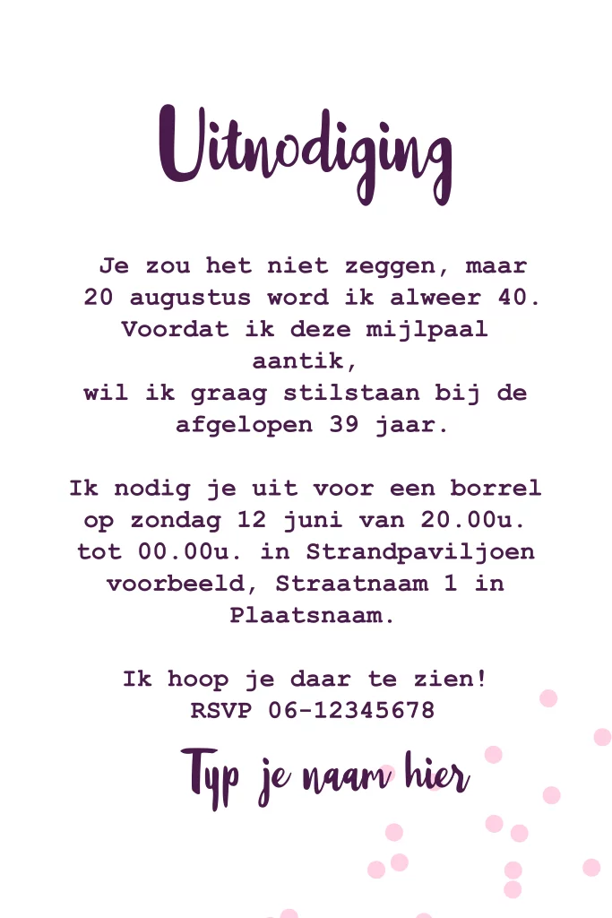 Kortom, met deze grappige uitnodiging 40 jaar maak jij van jouw verjaardagsfeestje een succes! Bestel nu en let's party!