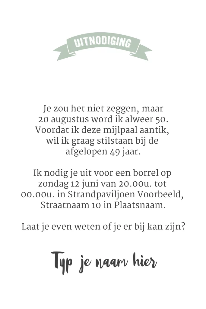 Pas de 40 jaar op de uitnodiging aan met je eigen leeftijd, onder de tekst op de mintgroene achtergrond. Schrijf een originele tekst voor aan de binnenzijde van de uitnodiging. Het is tijd voor een Party met familie en vrienden.