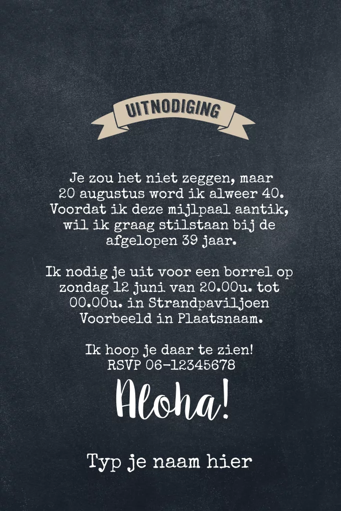 Smeer je in en laat de zon maar stralen, dit wordt een te gek strandfeest! Stoere zwarte binnenzijde van de uitnodigingskaart met genoeg ruimte voor een leuke uitnodigingstekst. Jaartal, kleuren teksten zijn aanpasbaar met de editor.
