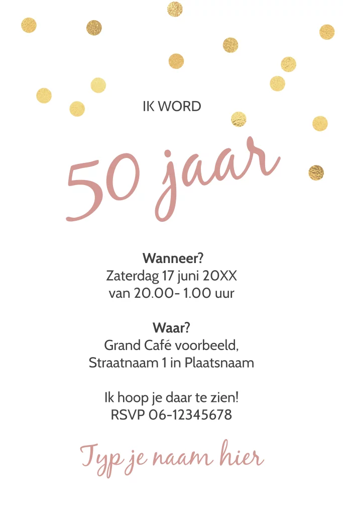 Met een mooi feestelijk design van grote gouden 50 jaar ballonnen met daaronder je naam groot op de uitnodigingskaart. Rondom staat sierlijke confetti. Alles op deze uitnodigingen kun je eenvoudig personaliseren met onze online-editor.