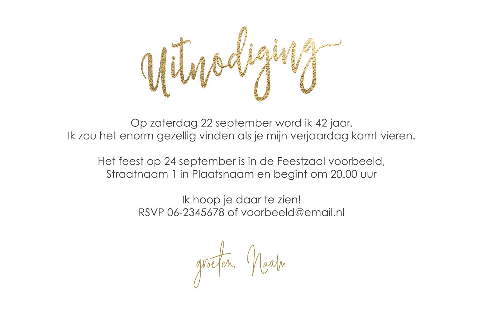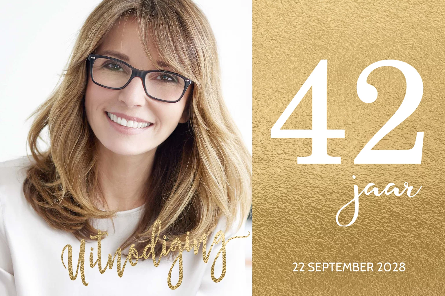Stijlvolle uitnodiging met je eigen foto en jouw leeftijd groots op de voorkant, op een luxueus goud effect achtergrondje. Geheel te personaliseren. De mooiste uitnodigingen maak je zelf bij Luckz.