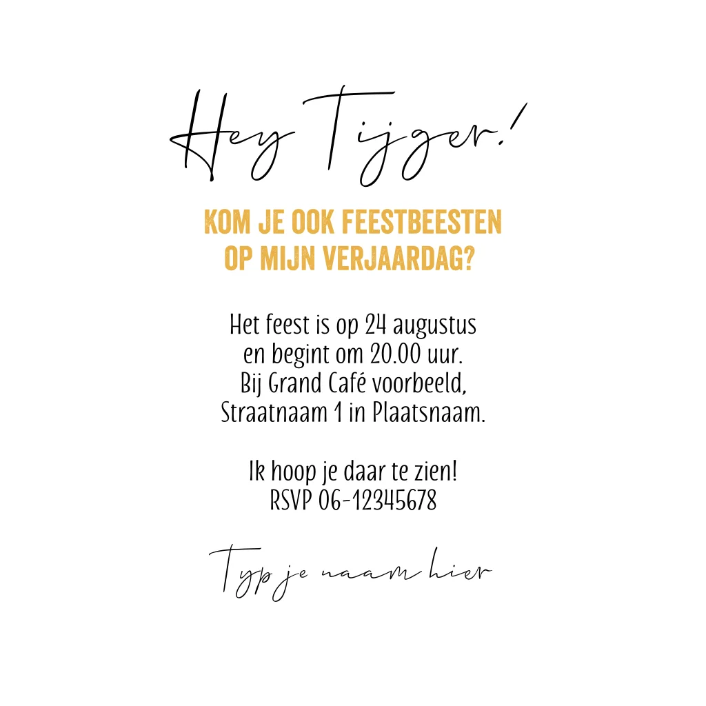 Ben je bijna jarig en ga je een feest geven? Nodig alle Party Animals uit met deze stoere en grappige uitnodiging met een textuur van een luipaard dieren vacht in hippe gele en zwarte kleuren. Alle teksten, kleuren, dierenprint en versieringen kun je zelf aanpassen.