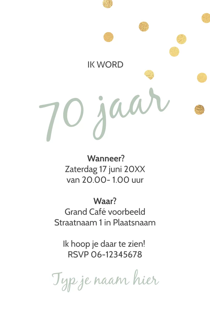 De mooiste uitnodigingen kun je zelf eenvoudig personaliseren bij Luckz voor je 70ste verjaardagsfeest.