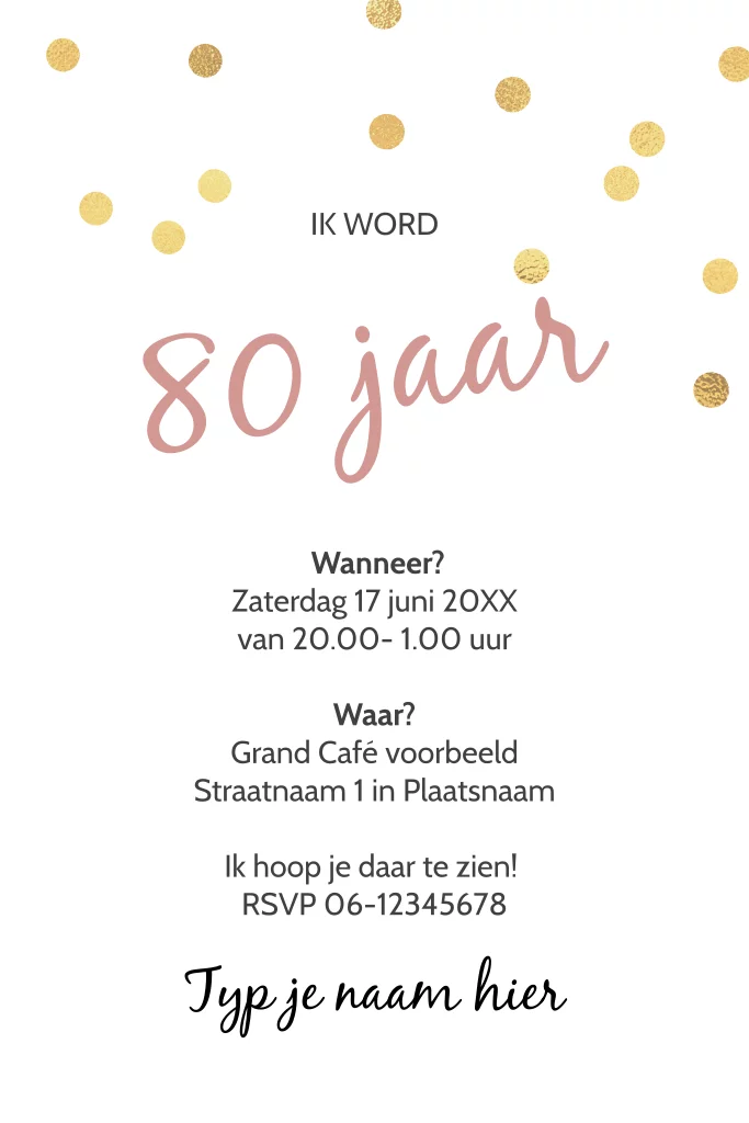 Deze schitterende leeftijd is een reden om een mooi verjaardagsfeest te vieren. Maak eenvoudig een unieke uitnodiging met 80 jaar en groots uw naam op de voorkant. Rondom feestelijke gouden confetti.