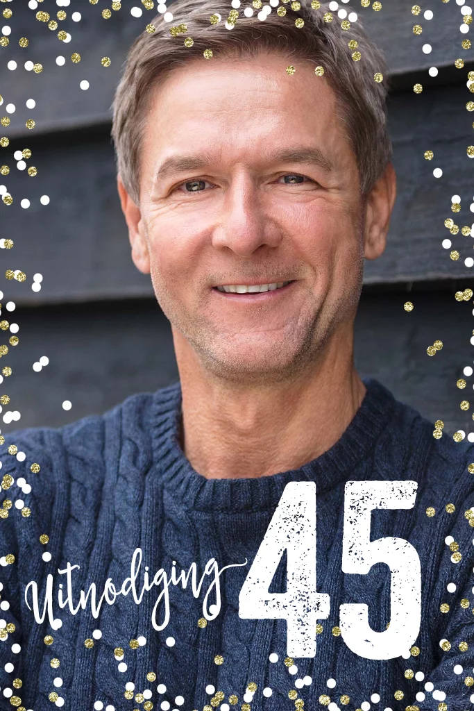 Deze uitnodigingskaart is enkelzijdig waar je zelf je eigen foto gemakkelijk in de achtergrond kan plaatsen. Rondom je foto staan leuke confetti stippen in goud en witte kleuren, met groot een jaartal die je zelf kan invullen naar bijvoorbeeld 40 jaar, 50 jaar of 60 jaar op de voorkant van de uitnodiging.
